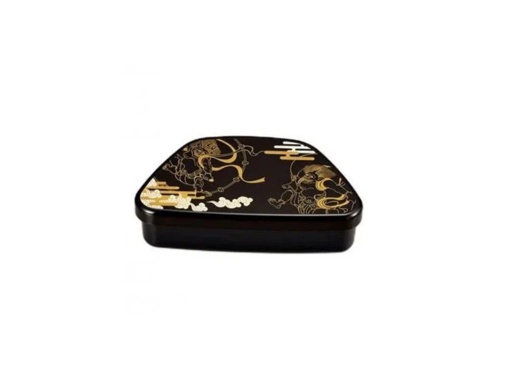 Tradiční motiv bohů: Víko zdobí ručně malovaný výjev bohů větru (Fúdžin) a hromu (Raidžin) v elegantní kombinaci bílé a zlaté barvy, která na lesklém černém podkladu působí mimořádně luxusním dojmem.
